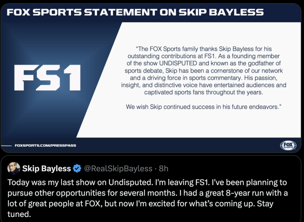 Bayless’s exit was characteristically unconventional. While former FS1 host Marcellus Wiley correctly predicted his departure, Bayless chose to announce it via Twitter instead of addressing it on air. Sources suggest that Bayless may hold resentment toward FS1 executives for not resolving his conflicts with Sharpe before they escalated.