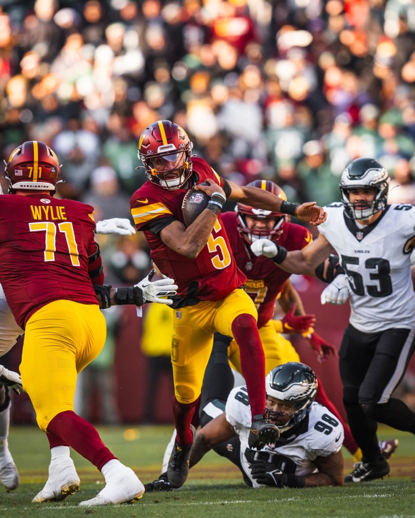 As Daniels prepares to face the Philadelphia Eagles and their seasoned quarterback Jalen Hurts, the stage is set for an epic showdown. Hurts, with his Super Bowl experience and dynamic playing style, presents a formidable challenge. However, Daniels’ impressive rookie season and ability to rise to the occasion in high-pressure situations make this matchup one for the ages. The battle between Daniels and Hurts will likely come down to who can best exploit the opposing defense’s weaknesses while minimizing turnovers. While Hurts has the edge in experience, boasting 3,858 passing yards and 15 touchdowns this season, Daniels’ dual-threat capabilities and accuracy could prove to be game-changers, especially if he can use his legs in key situations to extend play and connect on deep throws with “Scary Terry McLaurin” against the Eagles’ secondary.