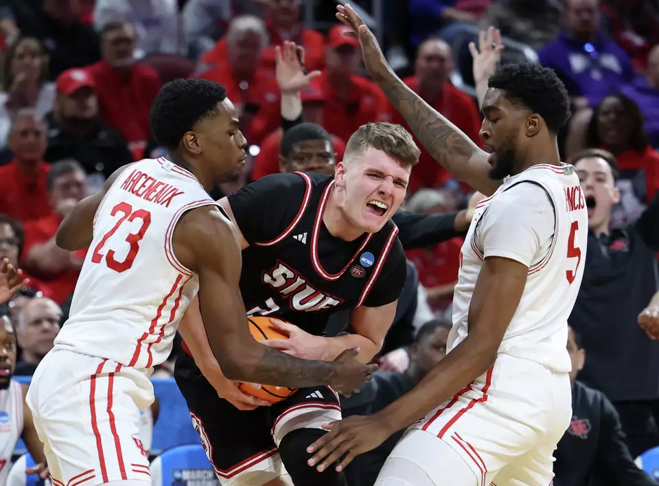 SIU Edwardsville forward Myles Thompson, center, tries to break through Houston guard Terrance Arceneaux (23), and forward Ja’Vier Francis (5) during the first half in the first round of the NCAA college basketball tournament, Thursday, March 20, 2025, in Wichita, Kan. Travis Heying/AP Photo (courtesy of the theIntelligencer)